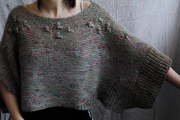 This oversized jumper is perfect for answering the door to trick-or-treaters and then retreating to the comfort of your home. Worked flat on the body and bottom up, we then worked in the round for the sleeves.