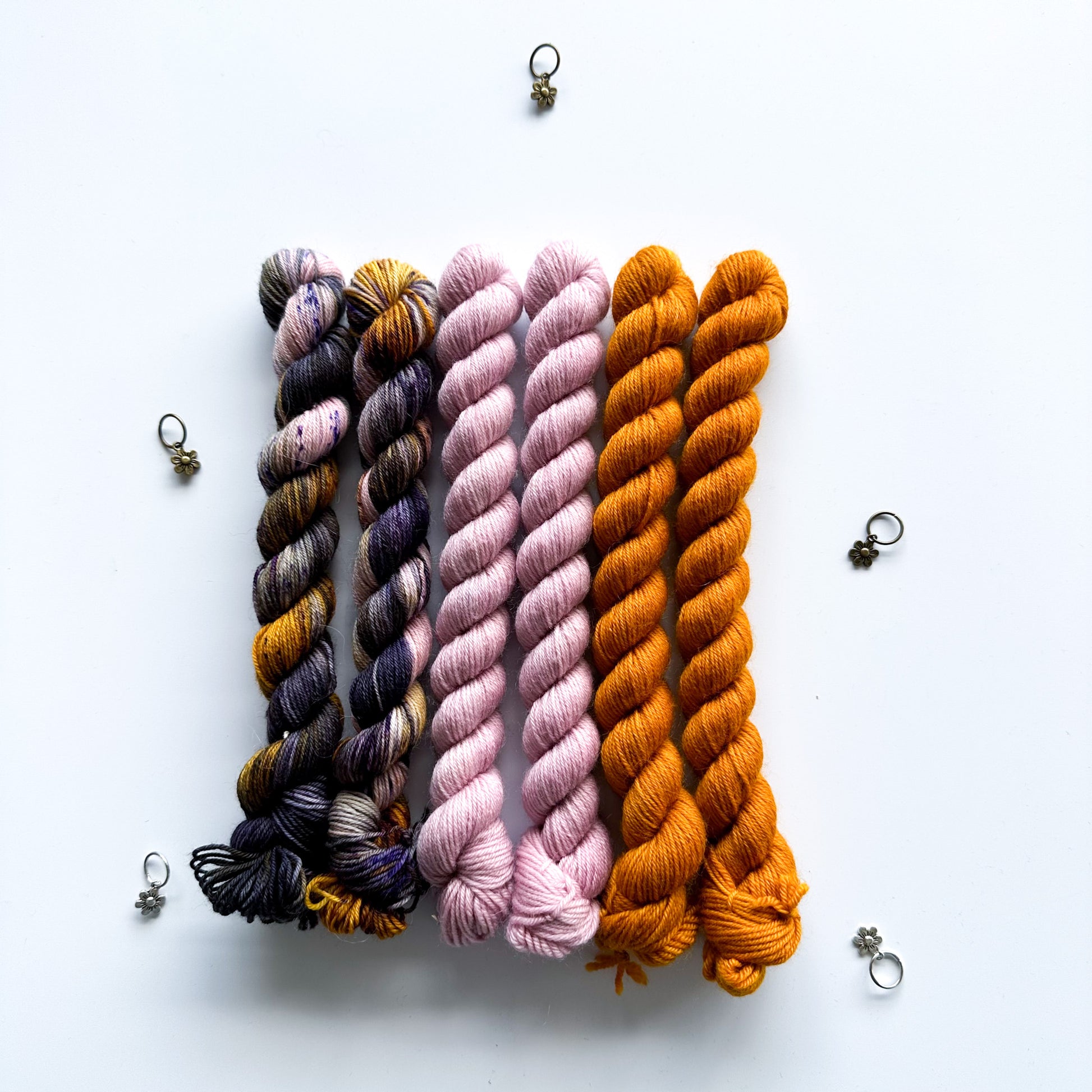 Your kit will be a random selection of 6 mini skeins from these bases in a range of colours: