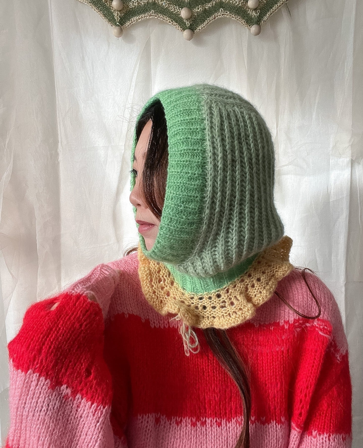 This charming balaclava is uses brioche stitch and honeycomb frill techniques, knitted with 2 skeins of our laceweight Veranita base.